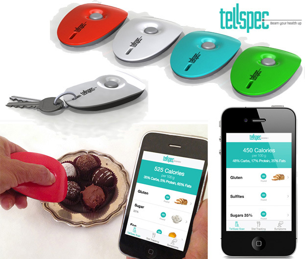 Tell Spec: Olyan kézi szkenner, amely megmondja az adott élelmiszerről, hogy az milyen összetevőket tartalmaz. A paramétereket továbbítja az okos telefonunk felé, így rögtön látjuk, hogy az ételben mennyi szénhidrát, kalória, fehérje, stb . található, illetve milyen allergénekkel kell számolni.Az általunk rögzített diéta alapján azt is meghatározza, miből mennyit ehetünk.